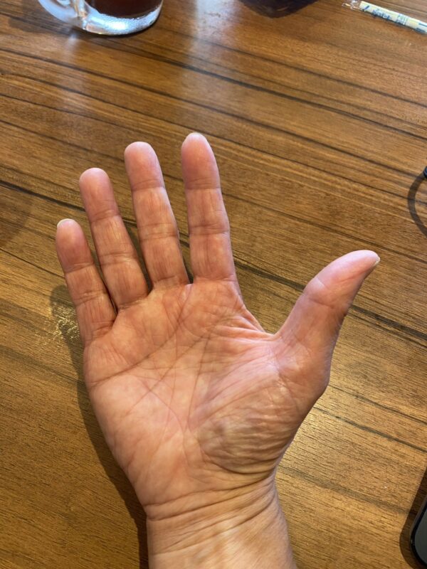 - 右手(後天): 掌は左手よりやや細長く、木星型(リーダー志向)の要素。指の関節が目立ち、経験を積んだ柔軟性が見られます。シワが左手より浅めで、定年後の変化が積極的。両手共通で、丘(木星丘・金星丘)が豊か。これは成功運と活力のサイン。